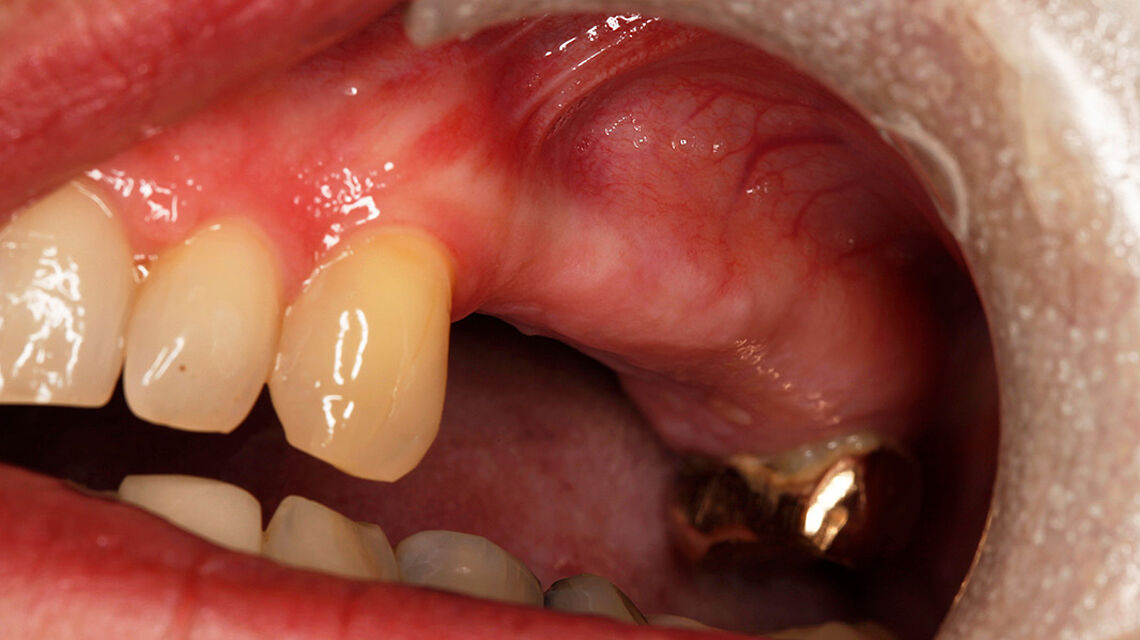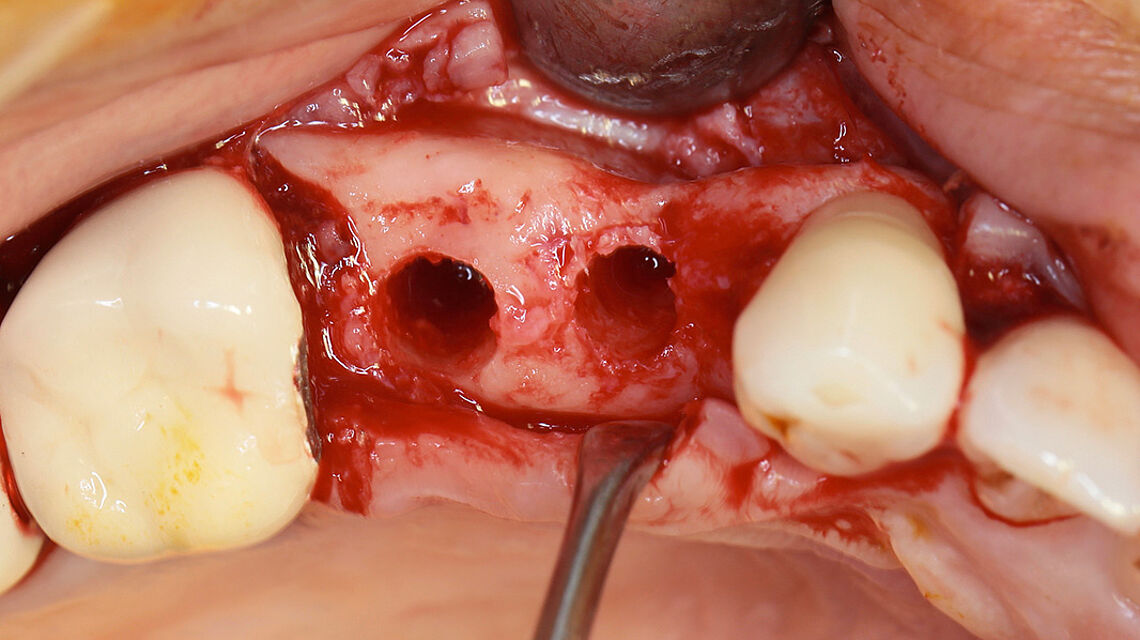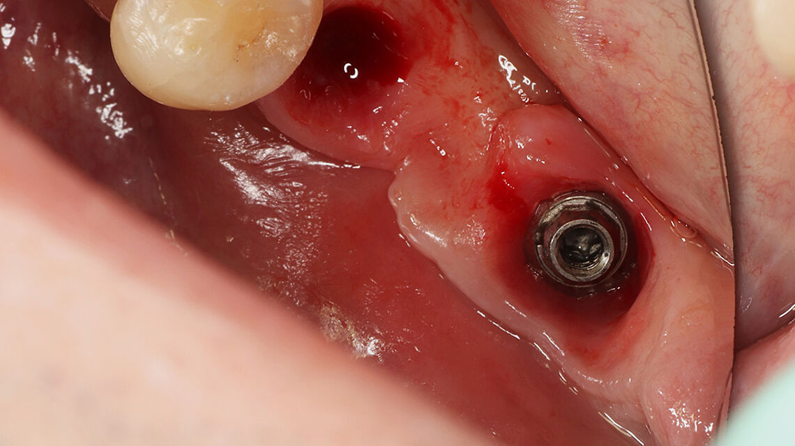 Dzięki optymalnej stabilizacji rany wspierana jest zarówno regeneracja kości, jak i tkanek miękkich w tym przypadku korekcji konturu przedsionkowego, ułatwiając gojenie, integrację i regenerację tkanek (2-letni okres obserwacji). Proces gojenia tkanek miękkich przebiega z mniejszą dehiscencją i większym bezpieczeństwem terapeutycznym podczas stosowania Striate+. Membranę można umieścić nad kością i implantami stomatologicznymi - idealnie bez jakiegokolwiek przesunięcia.